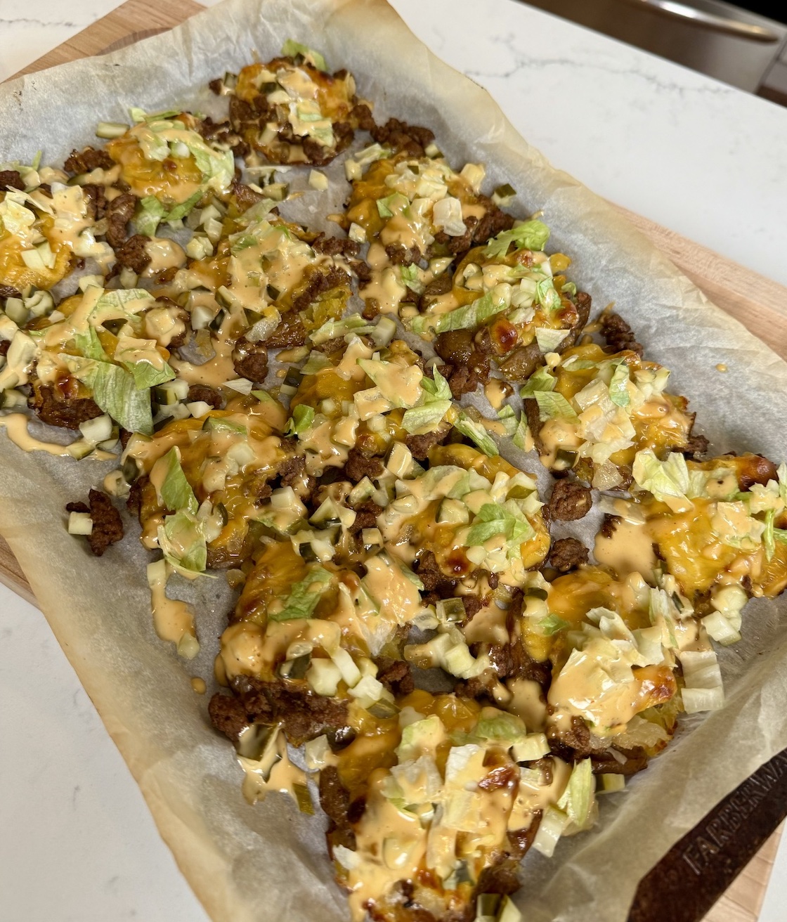 - Top and Serve: Once the potatoes are out of the oven, top them with shredded lettuce, diced pickles, and a drizzle of the secret sauce. Serve with extra sauce on the side and enjoy!