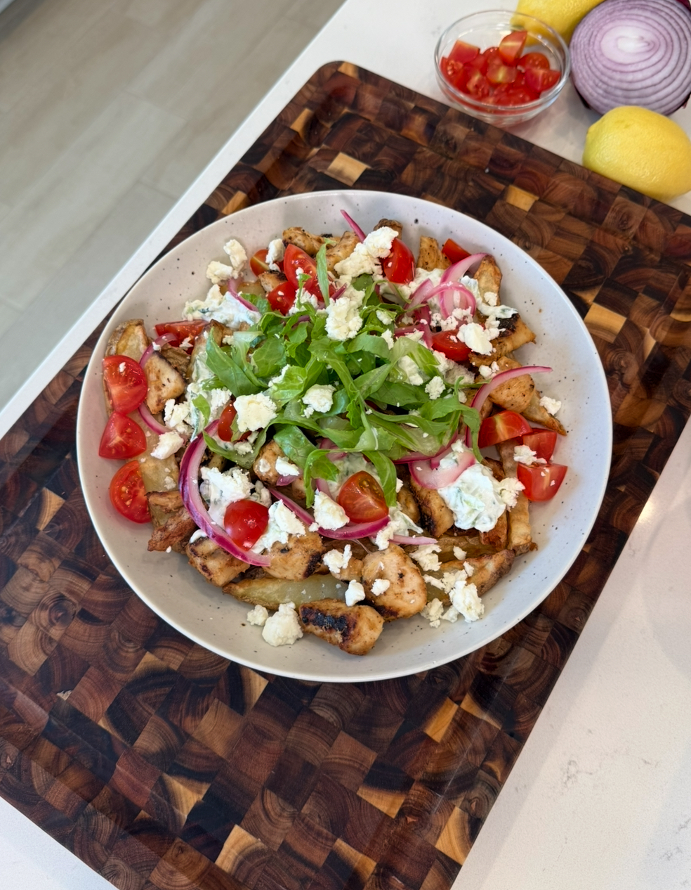 - Start with a layer of fries, then top with the chicken souvlaki. Add shredded romaine, diced tomatoes, crumbled feta, and a generous spoonful of those quick-pickled onions. Finish with a dollops of tzatziki and dig in while everything’s still warm and crispy. Enjly!
