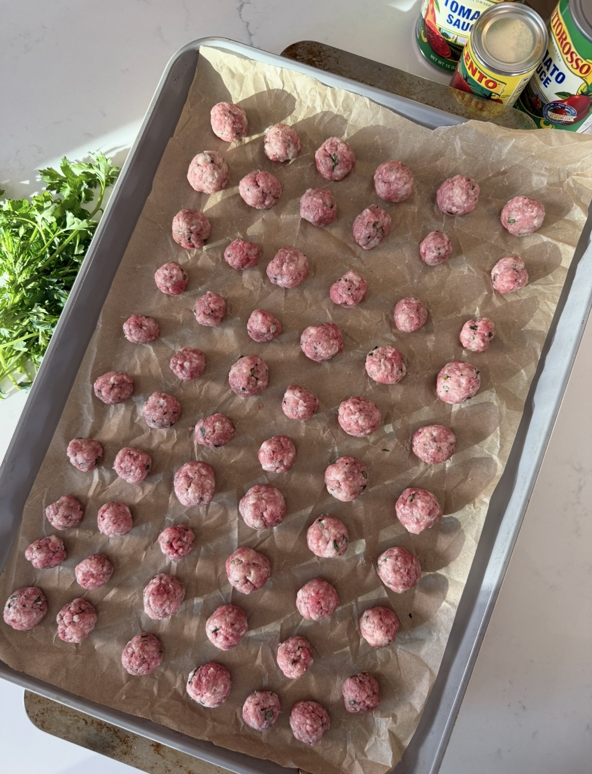 - Roll into small, marble-size meatballs and arrange on a parchment lined baking sheet.