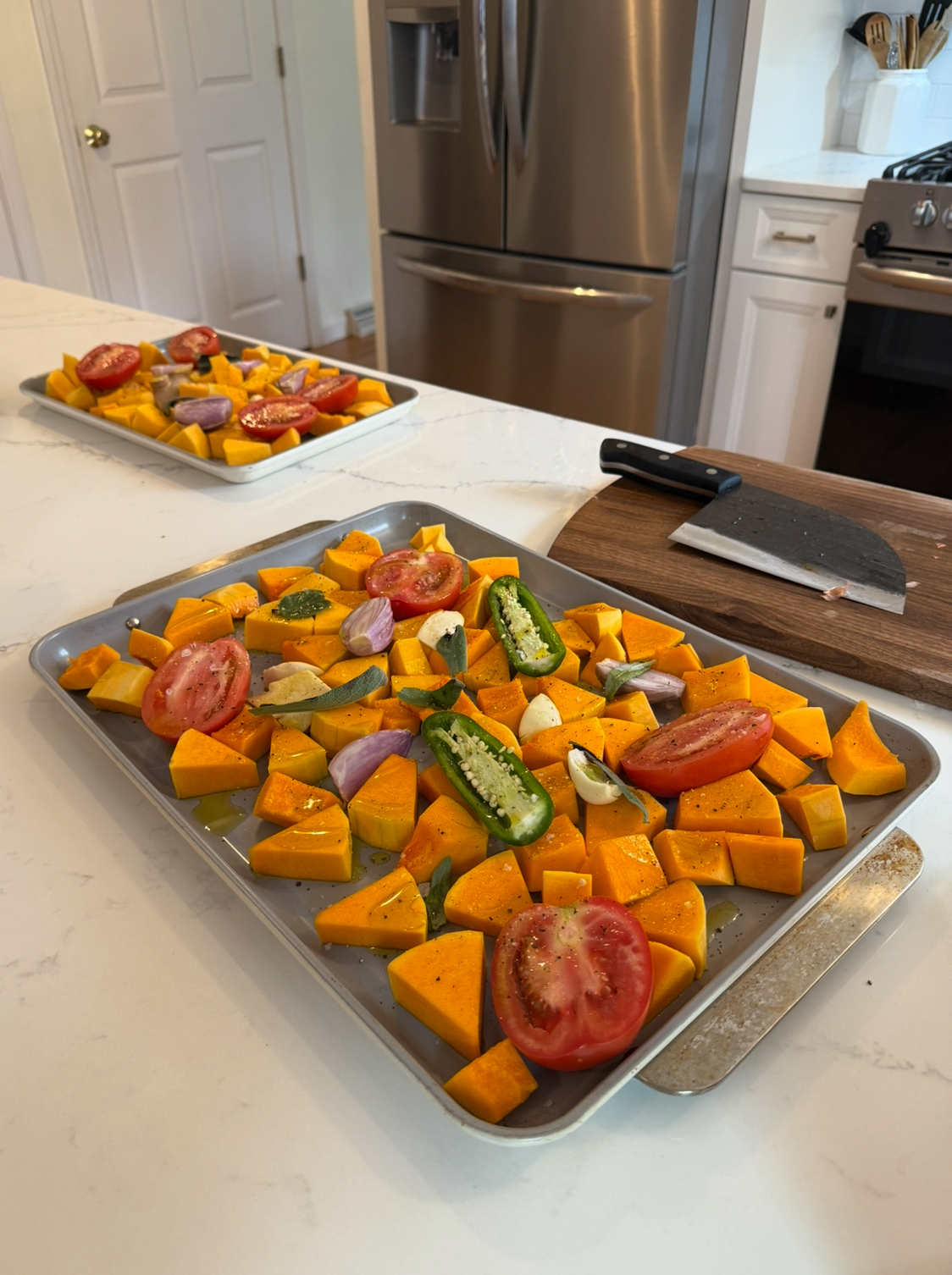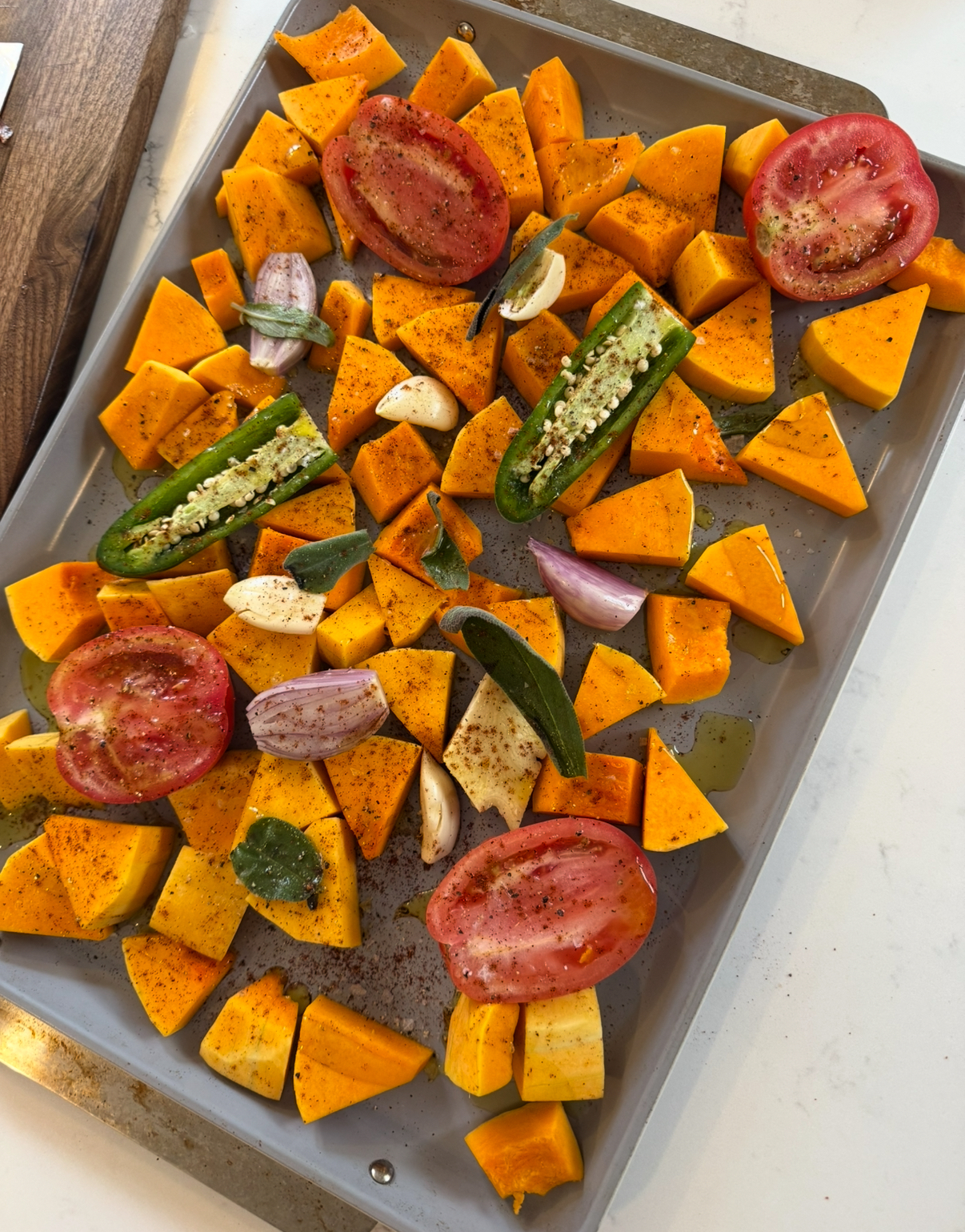 - Preheat oven to 425°F and line a baking sheet with parchment. Add squash, shallots, jalapeño, garlic, ginger, tomatoes, and sage to the sheet pan. Drizzle with 2 tablespoons olive oil, then season with salt, pepper, and chili powder. Roast 25–30 minutes, or until the squash is fork-tender and lightly caramelized.