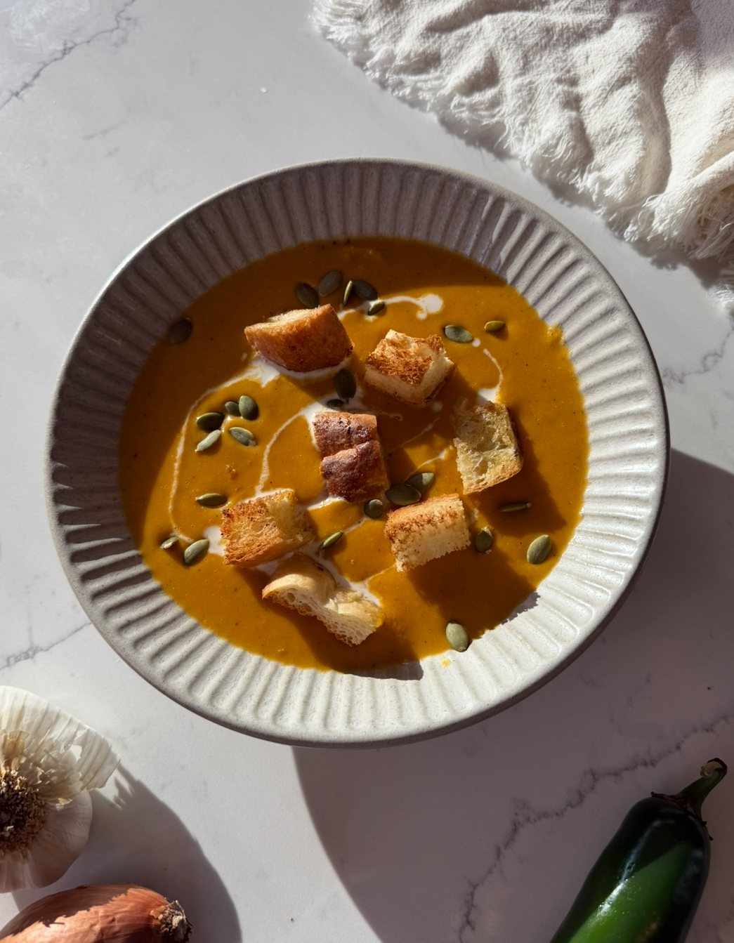 - Ladle into bowls and garnish with a swirl of heavy cream, crunchy sourdough croutons or grilled cheese and toasted pumpkin seeds. Enjoy!